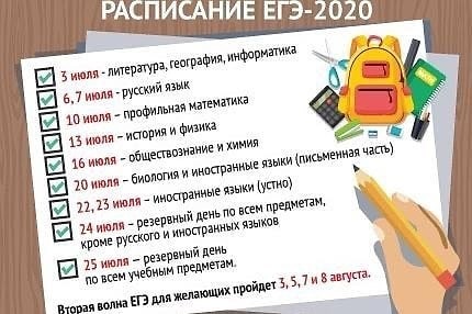 Министерством просвещения РФ и Рособрнадрозом утверждены сроки проведения единого государственного экзамена (ЕГЭ) в 2020 году. Соответствующий приказ зарегистрирован Минюстом. ЕГЭ пройдет по единому расписанию, которое предусматривает проведение пробного экзамена, основного и дополнительного периодов ЕГЭ. В соответствии приказом, основной период ЕГЭ в 2020 году начнется с пробного экзамена 29 и 30 июня, в ходе которого будут протестированы все экзаменационные процедуры. 3 июля пройдут ЕГЭ по географии, литературе и информатике; 6 и 7 июля – ЕГЭ по русскому языку; 10 июля – по профильной математике; 13 июля – по истории и физике; 16 июля – по обществознанию и химии; 20 июля – по биологии и письменной части ЕГЭ по иностранным языкам; 22 и 23 июля пройдет устная часть ЕГЭ по иностранным языкам. Резервные дни запланированы на 24 июля (по всем учебным предметам, кроме русского языка и иностранных языков) и 25 июля – по всем учебным предметам. Для участников, которые по уважительным причинам не смогут сдать ЕГЭ в июле, предусмотрен дополнительный период проведения экзаменов в августе.