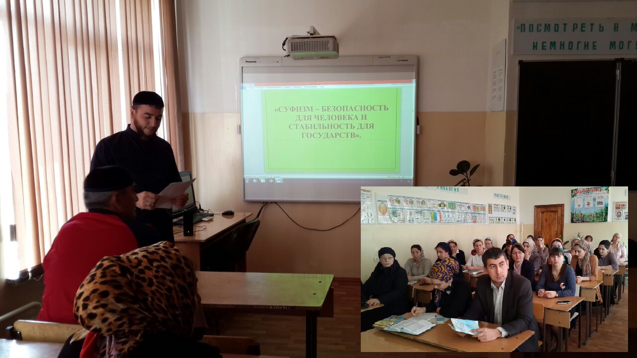 В рамках реализации Единой Концепции по духовно-нравственному развитию и воспитанию подрастающего поколения, с целью разъяснения основ суфизма и формирования негативного отношения к идеологии экстремизма в молодежной среде, в МБОУ «СОШ № 1 с. п. Надтеречное» в течение февраля педагогом-организатором по ДНВР Базуркаевым И.И. были проведены беседы среди учащихся 7-11 классов на тему: «Суфизм – безопасность для человека, стабильность для государств». Роль суфизма в наставлении на исламскую этику, защите от чрезмерности и экстремизма, и установлении уз милосердия и непрерывных дружественных связей между народами». Также педагог-организатор по ДНВР Базуркаев И.И. провел разъяснительную работу и среди коллектива учителей с показом видео-роликов на тему: «Суфизм – безопасность для человека, стабильность для государств».