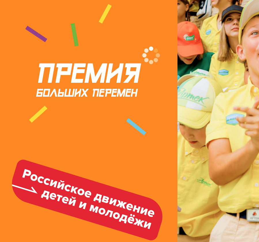 07.10.2022В 2022 году в рамках популяризации Общероссийскогообщественно-государственного движения детей и молодежи запущенаВсероссийская премия «Больших перемен» (далее - Премия) -проект, в рамках которого дети, родители, педагоги определят лучшиепроекты в 10 номинациях в сфере науки, образования, творчества,здравоохранения, туризма, сохранения исторической памяти,телекоммуникаций и других. Детьми, педагогами и родителямив рамках народного голосования будут отобраны 200 лучшихпроектов из всех регионов России, среди которых в рамках финалаПремии эксперты в различных отраслях определят победителей.