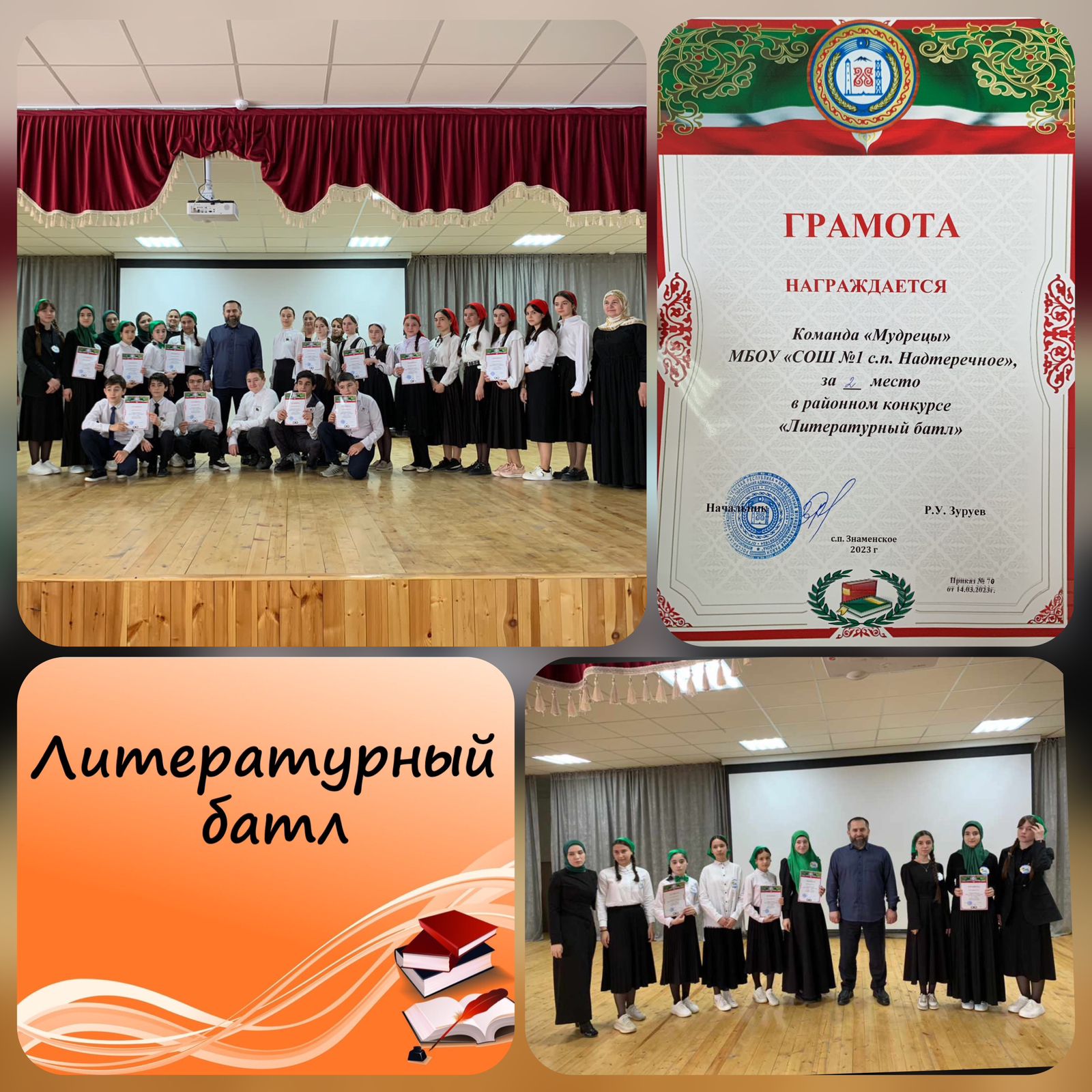 28.03.2023В целях усиления роли книги и чтения на развитие гармоничной, духовно-нравственной личности детей и подростков, создания условий для совместной деятельности по формированию информационной культуры обучающихся общеобразовательных организаций Надтеречного муниципального района 28 марта 2023 года на базе МБОУ «СОШ No 2 с.п. Знаменское» прошел муниципальный конкурс «Литературный батл», приуроченный Году чтения в Чеченской Республике среди школьных команд из числа обучающихся 7-8 классов. Команда «Мудрецы» МБОУ «СОШ1 с.п. Надтеречное» заняла почетное 2 место! 🥳
