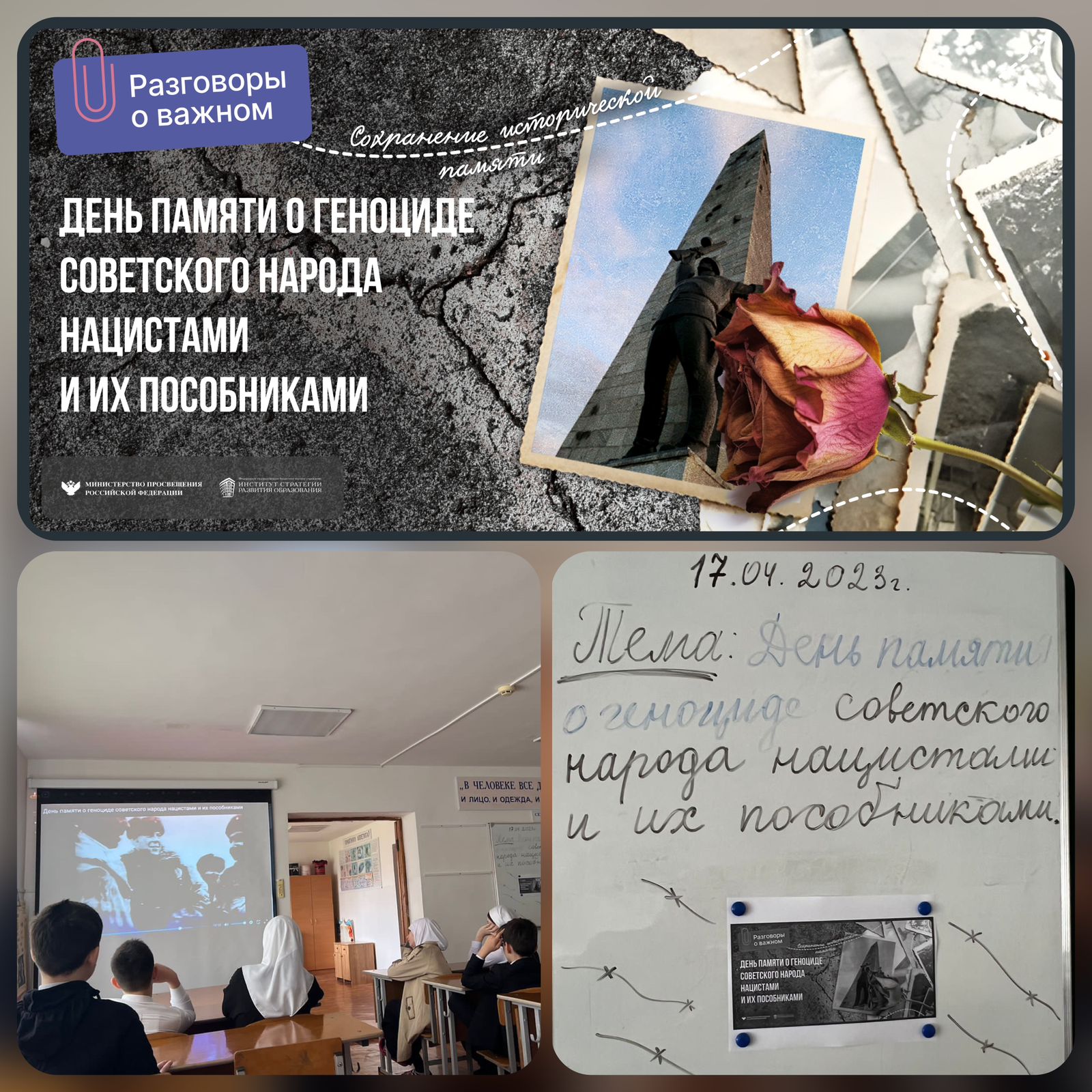 17.04.2023ВНЕУРОЧНОЕ ЗАНЯТИЕ Разговоры о важном на тему «ДЕНЬ ПАМЯТИ О ГЕНОЦИДЕ СОВЕТСКОГО НАРОДА НАЦИСТАМИ И ИХ ПОСОБНИКАМИ» Цель занятия: формирование у обучающихся понимания необходимости сохранения исторической памяти и преемственности поколений на примере истории геноцида мирных советских граждан со стороны нацистов и их пособников в годы Великой Отечественной войны 1941–1945 гг.