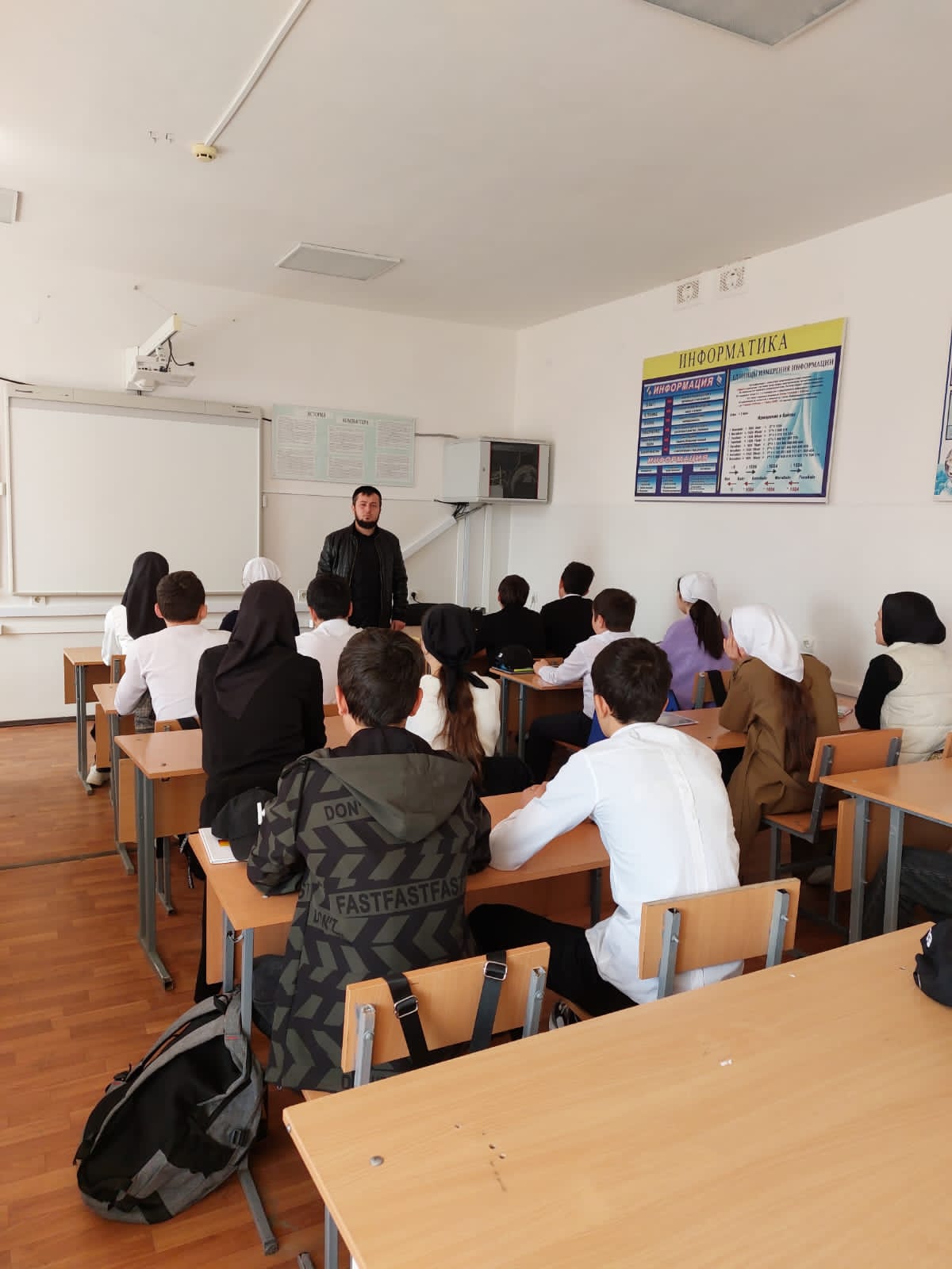 Махтиев А.А. педагог по ДНВ МБОУ СОШ 1 с.п. Надтеречное провёл беседу на тему: "Духовный лидер и наставник, ушедший непобежденным".