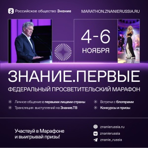 С 4 по 6 ноября 2023 года состоится Федеральный просветительский марафон Российского общества «Знание» — Знание.Первые. Марафон стартует в день открытия Международной выставки-форума «Россия» на ВДНХ в Москве и будет проходить на шести площадках в разных павильонах.
