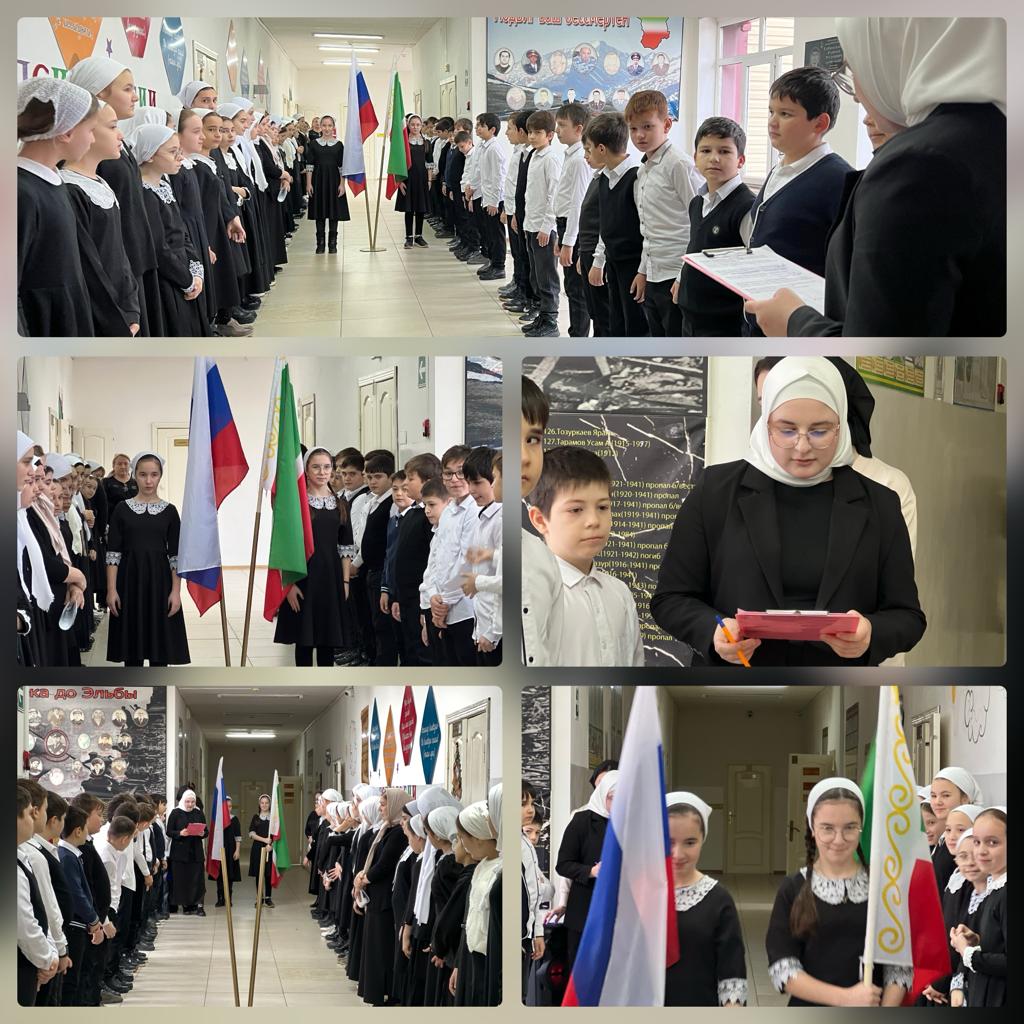 11.12.2023По традиции понедельник, 11 декабря 2023 года, начался с торжественной церемонии установки государственных флагов Российской Федерации и Чеченской Республики. После церемонии установки флагов прошло занятие внеурочного курса «Главный закон страны»