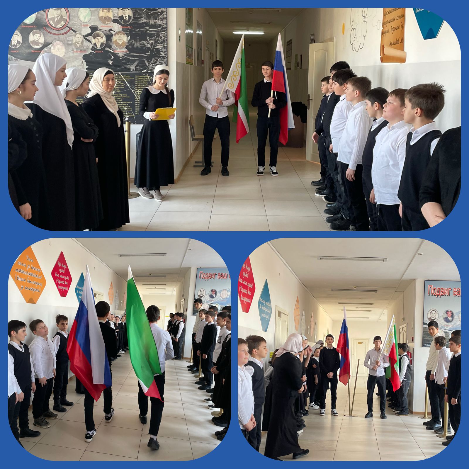 04.03.2024Учебная неделя в МБОУ «СОШ1 с.п. Надтеречное» началась с торжественной церемонии вноса и установки Государственных флагов Российской Федерации и Чеченской Республики под Государственные гимны. Почетное право предоставили ученикам дежурного 9В класса Татриеву Мансуру и Ахмадову Имаму