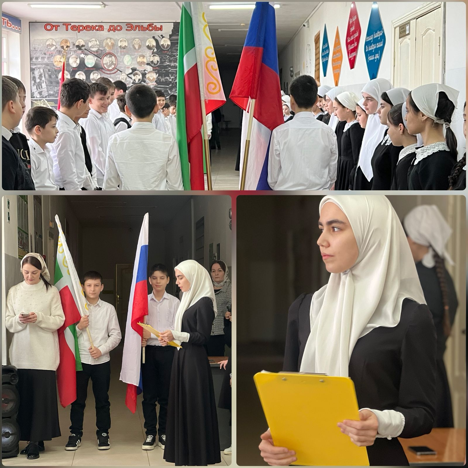 Еженедельная линейка в МБОУ «СОШ1 с.п. Надтеречное». Почетное право установить флаг Российской Федерации и флаг Чеченской Республики предоставили ученикам дежурного 6А класса Дадаеву Адаму и Халмышеву Дени
