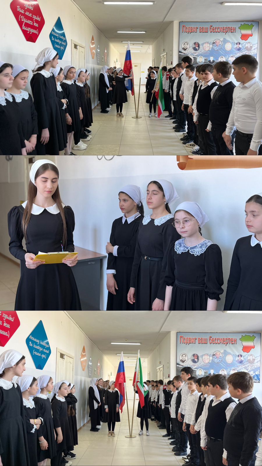 Еженедельная линейка в МБОУ «СОШ1 с.п. Надтеречное». Почетное право установить флаг Российской Федерации и флаг Чеченской Республики предоставили ученикам дежурного 6Б класса Сагаиповой Айшат и Эльмурзаевой Саадат
