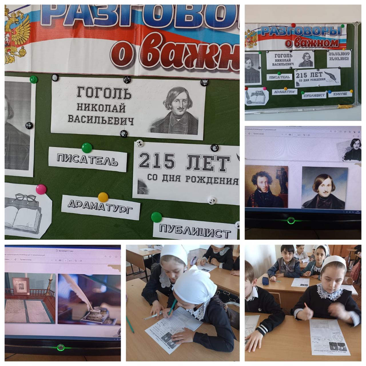15.04.2024Разговоры о важном. Тема внеурочного занятия: «215-летие со дня рождения Н. В. Гоголя» Цель занятия: популяризация русской классической литературы; знакомство с творчеством великого русского писателя Н. В. Гоголя; формирование интереса к его творчеству, чувства принадлежности к историческому прошлому и культуре России, расширение общекультурного кругозора.