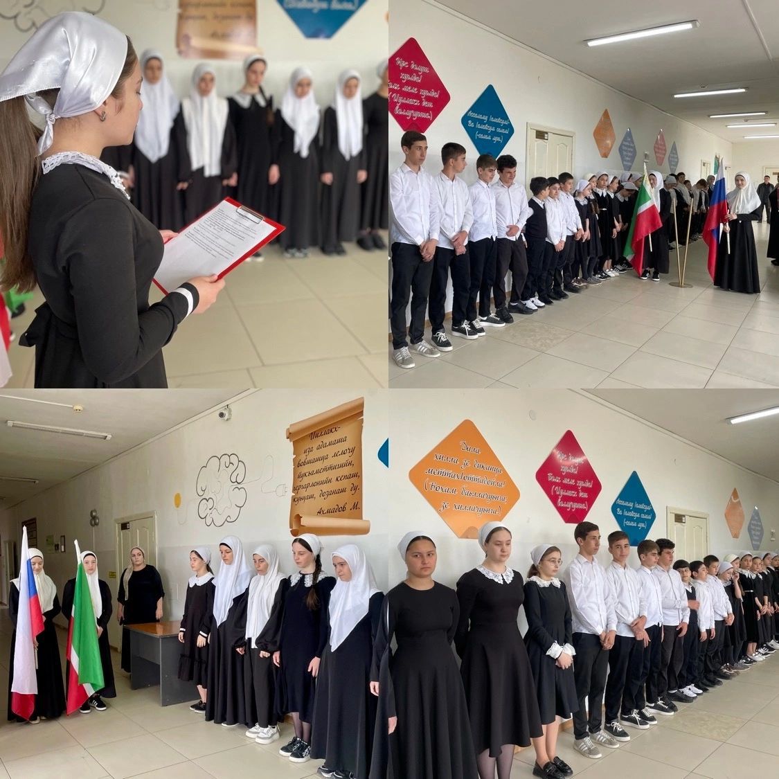 13.05.2024Учебная неделя в МБОУ «СОШ N°1 с.п. Надтеречное» началась с торжественной церемонии установки Государственных флагов Российской Федерации и Чеченской Республики под Государственные гимны. Почетное право предоставили обучающимся 8 «А» класса