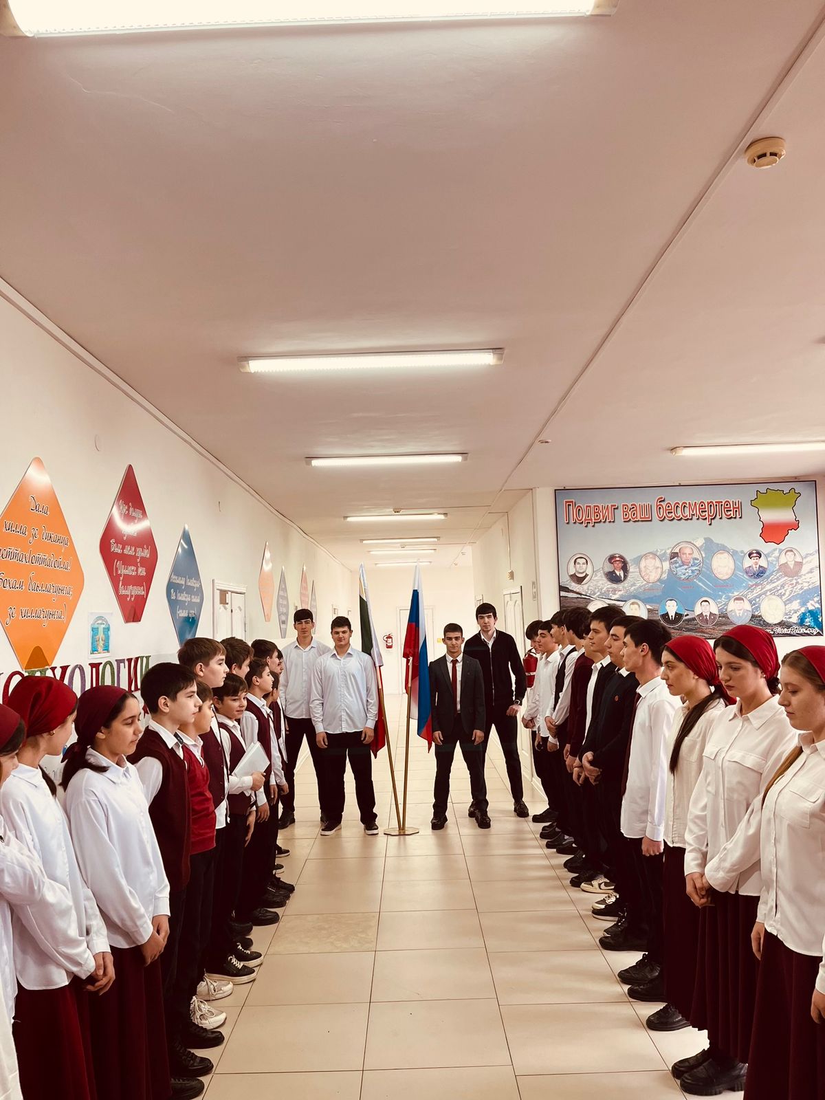 02.12.2024Учебная неделя в МБОУ «СОШ N°1 с.п.Надтеречное» началась с торжественной церемонии установки Государственных флагов Российской Федерации и ЧеченскойРеспублики под Государственные гимны.Почетное право предоставили обучающимся 11 класса
