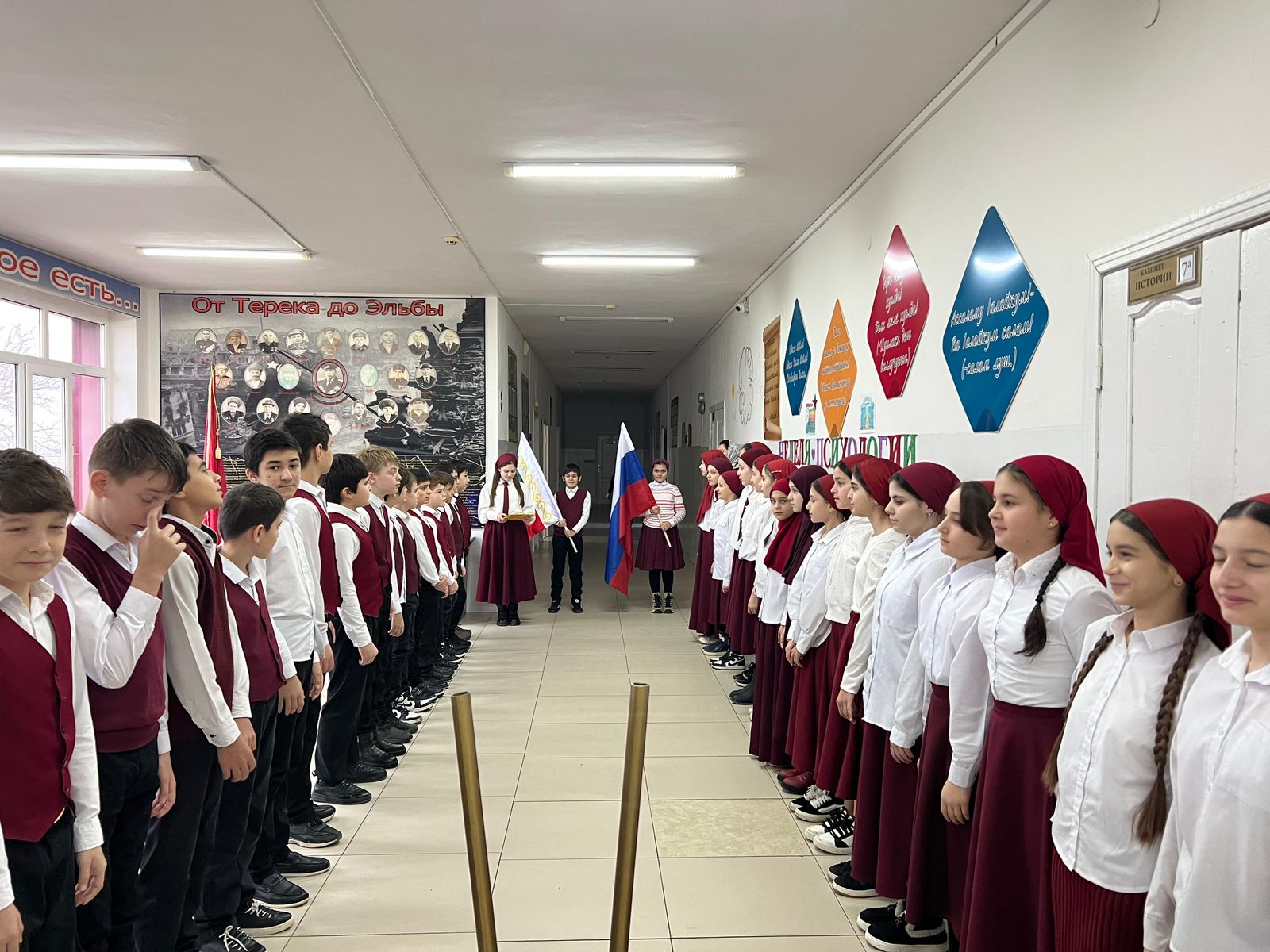 09.12.2024Учебная неделя в МБОУ «СОШ N°1 с.п. Надтеречное» началась с торжественной церемонии установки Государственных флагов Российской Федерации и Чеченской Республики под Государственные гимны.Почетное право предоставили обучающимся 5 «А» класса