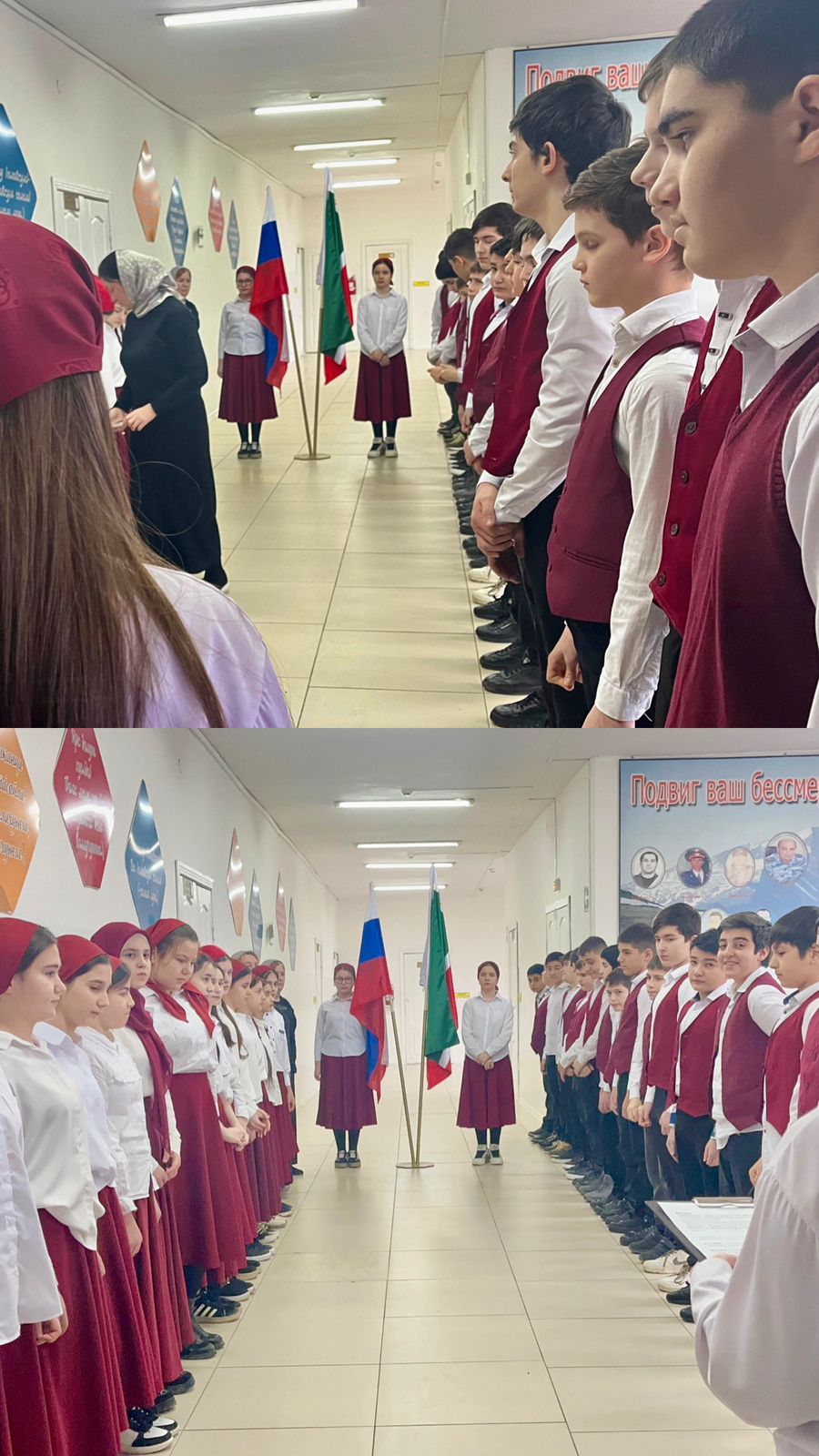 27.01.2025Учебная неделя в МБОУ «СОШ N°1 с.п.Надтеречное» началась с торжественной церемонии установки Государственных флагов Российской Федерации и ЧеченскойРеспублики под Государственные гимны.Почетное право предоставили обучающимся 7 «Б» класса