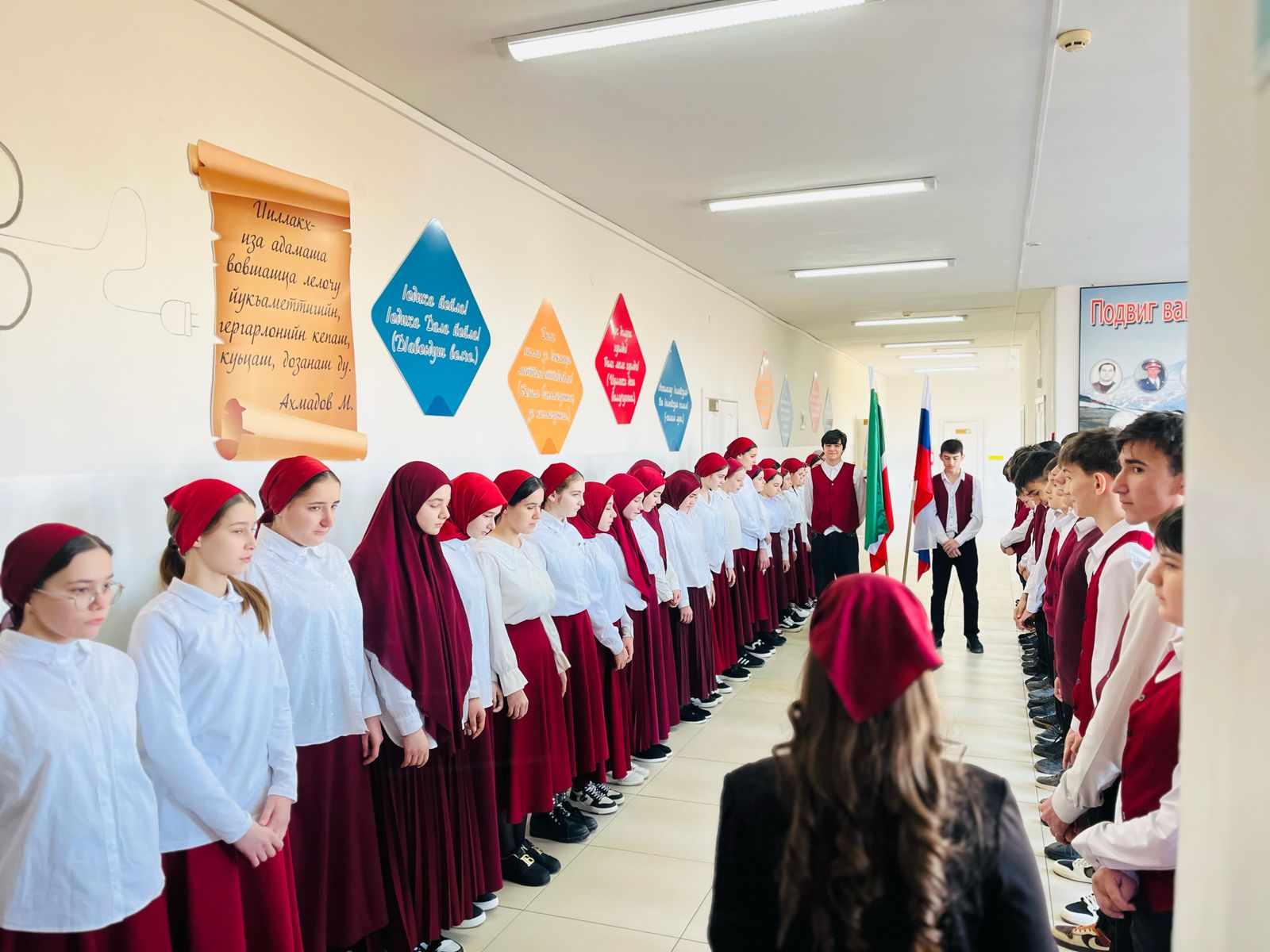 10.02.2025Учебная неделя в МБОУ «СОШ N°1 с.п.Надтеречное» началась с торжественной церемонии установки Государственных флагов Российской Федерации и ЧеченскойРеспублики под Государственные гимны.Почетное право предоставили обучающимся 8 «Б» класса