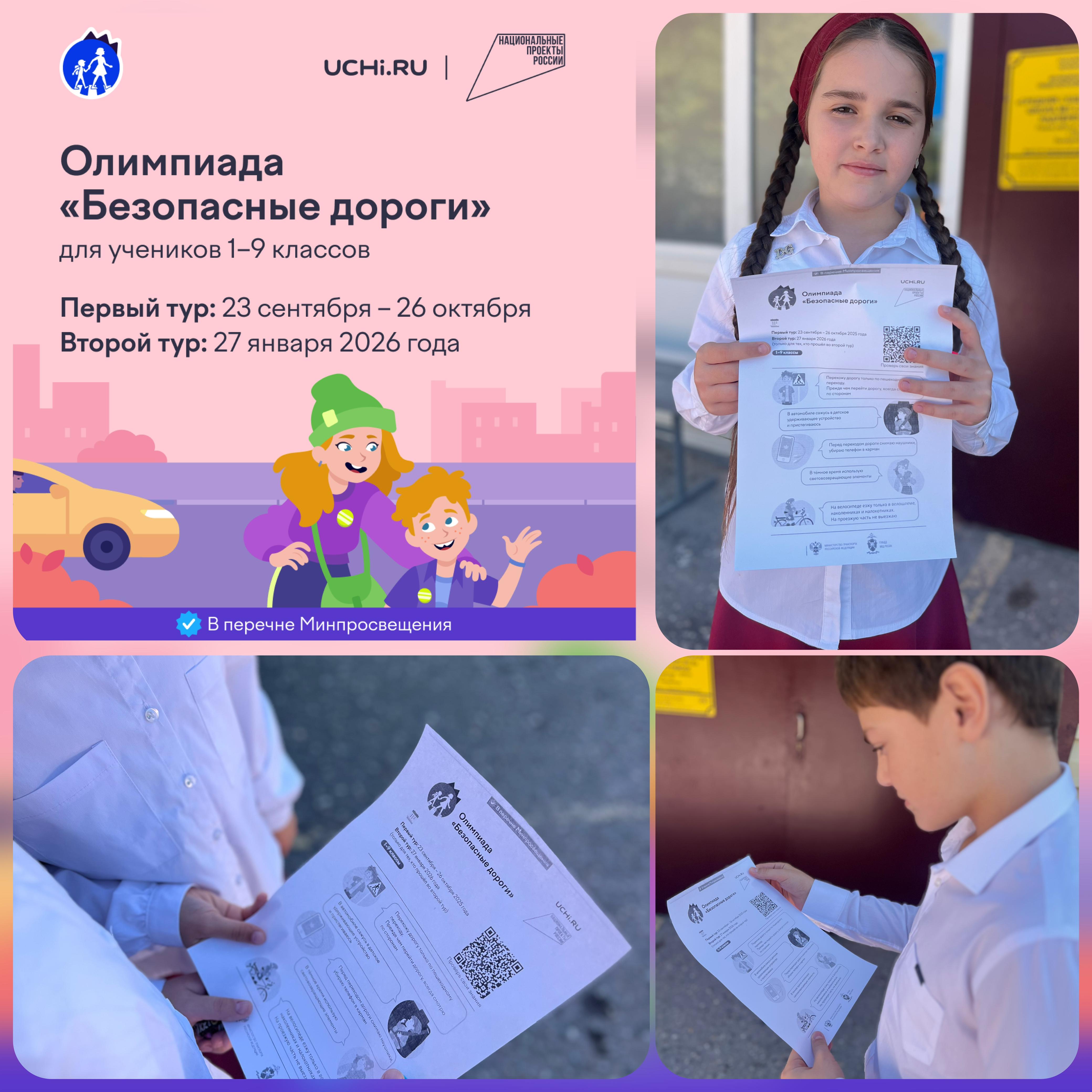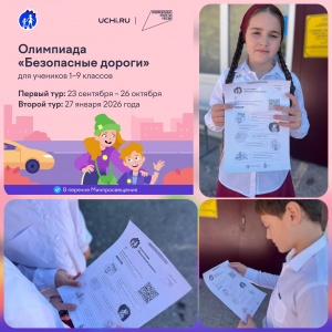 22.09.2025В рамках национального проекта «Инфраструктура для жизни» Минтранс России, ГУОБДД МВД России и АНО «Национальные приоритеты» при поддержке Министерства Просвещения проводят всероссийскую онлайн-олимпиаду для школьников 1-9 классов «Безопасные дороги» на знание основ безопасного поведения на дорогах.Олимпиада пройдет на образовательной платформе Учи.ру с 23 сентября по 26 октября 2025 года.Участие в Олимпиаде БЕСПЛАТНОЕ. Для прохождения Олимпиады необходимо иметь компьютер или планшет с современным браузером и выходом в Интернет.
