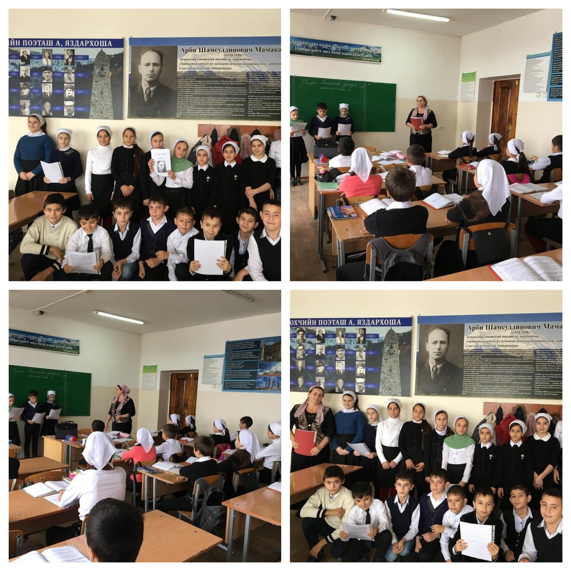 100 – летию со дня рождения классика чеченской литературы Мамакаева Арби Шамсудиновича «Кавказ я был твоим…». Учащиеся читали самые известные стихотворения поэта на чеченском языке: «Бералла», «Теркан тулг1енаш», «Сан к1анте», «Лаха-Невре», «Сарахь Теркан тог1ехь», «1ожалла», «Даге». Были исполнены песни о любви к родному краю. Был продемонстрирован видеоролик, который до этого учительницей чеченского языка Гинаевой Н.У. и учащимися 10-го класса был снят в музее им. Арби Мамакаева. Также была поставлена инсценировка «Нохчийн лаьмнашкахь» (А.Ш.Мамакаева)
